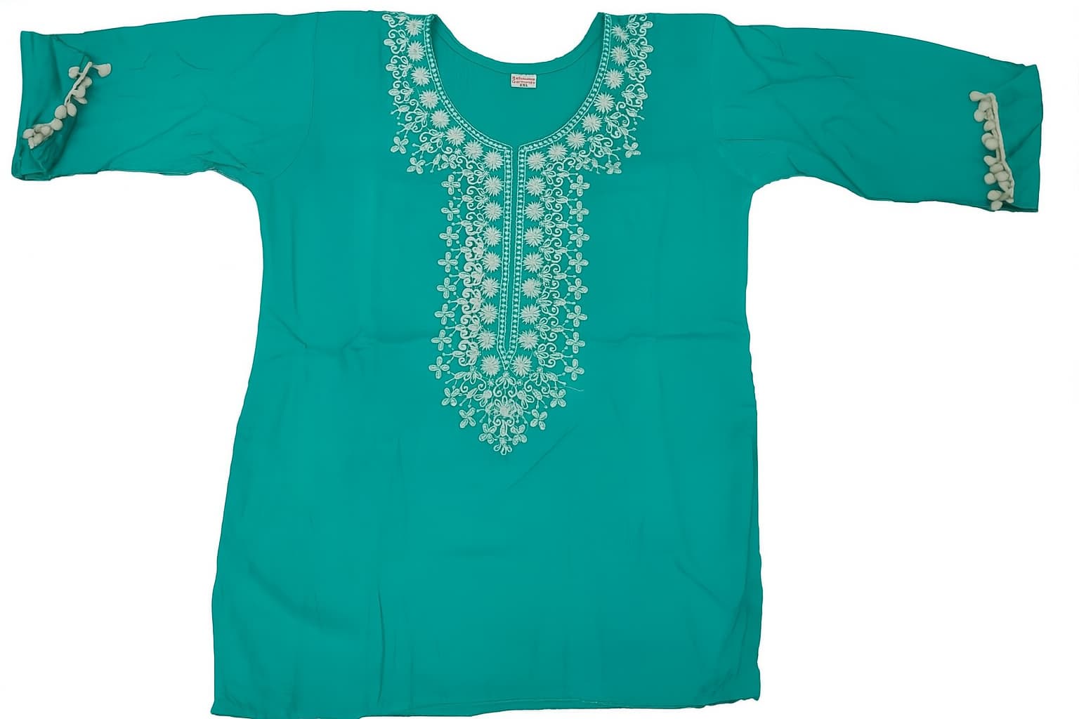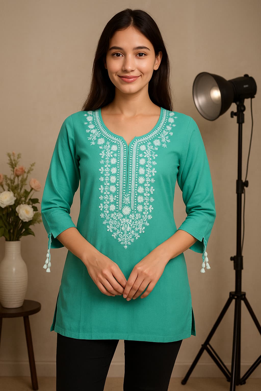Meet our Teal Temptation Chikankari Kurti – where tradition flirts with modern sass. Embellished with delicate white thread embroidery that screams “I come from heritage, honey,” and featuring charming shell-style tassels on the sleeves to make your hand gestures 80% sassier.