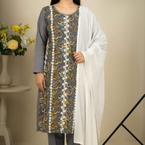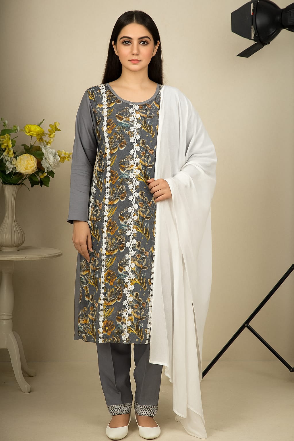 Grey suit with white dupatta = simplicity at its peak ✨. Classy, comfy, and office-perfect.