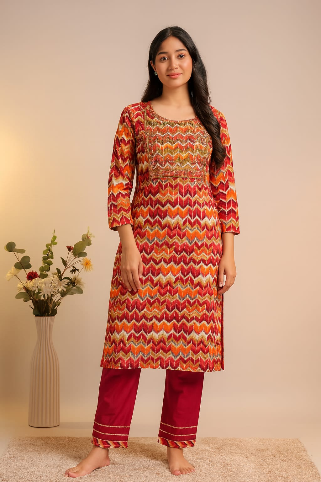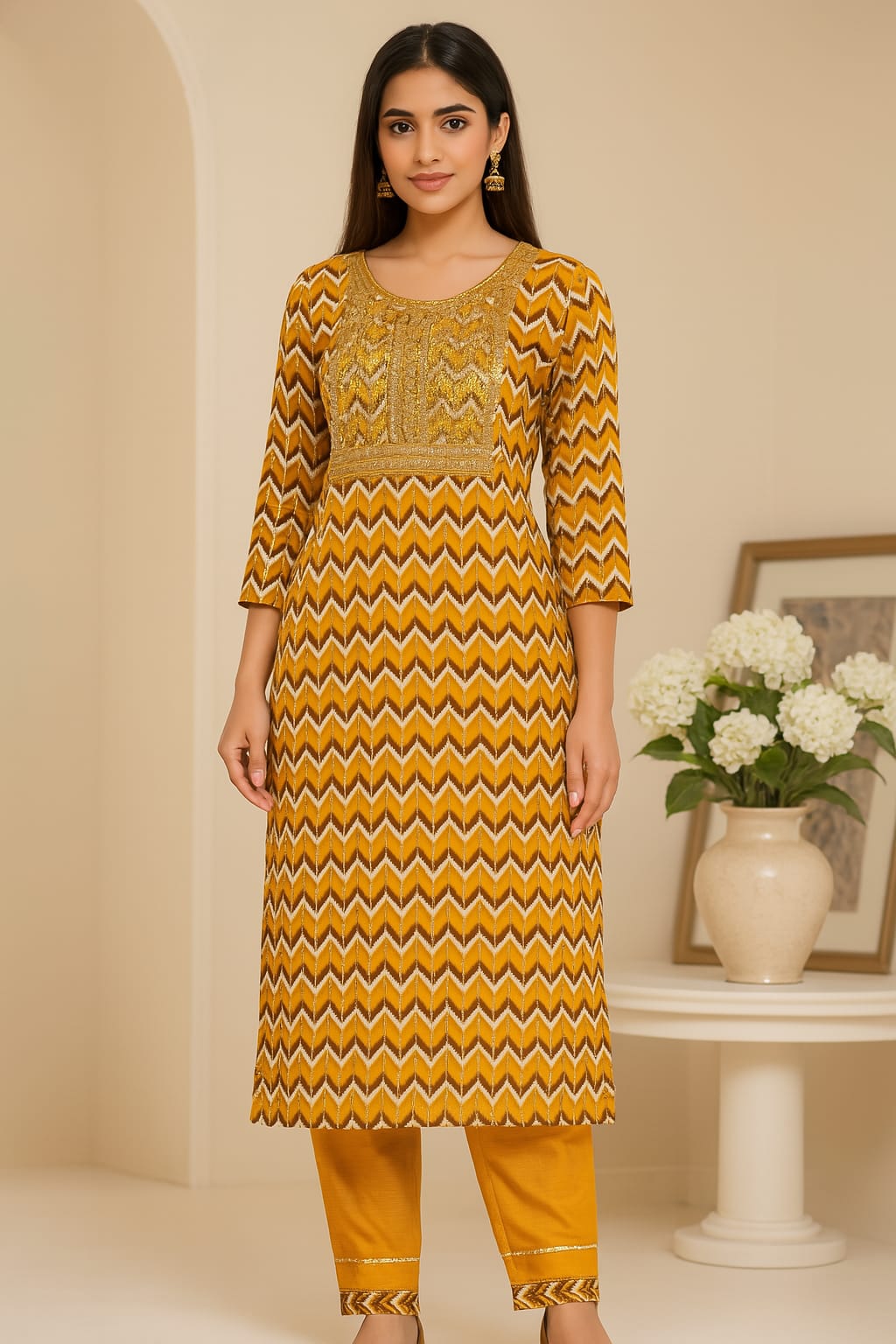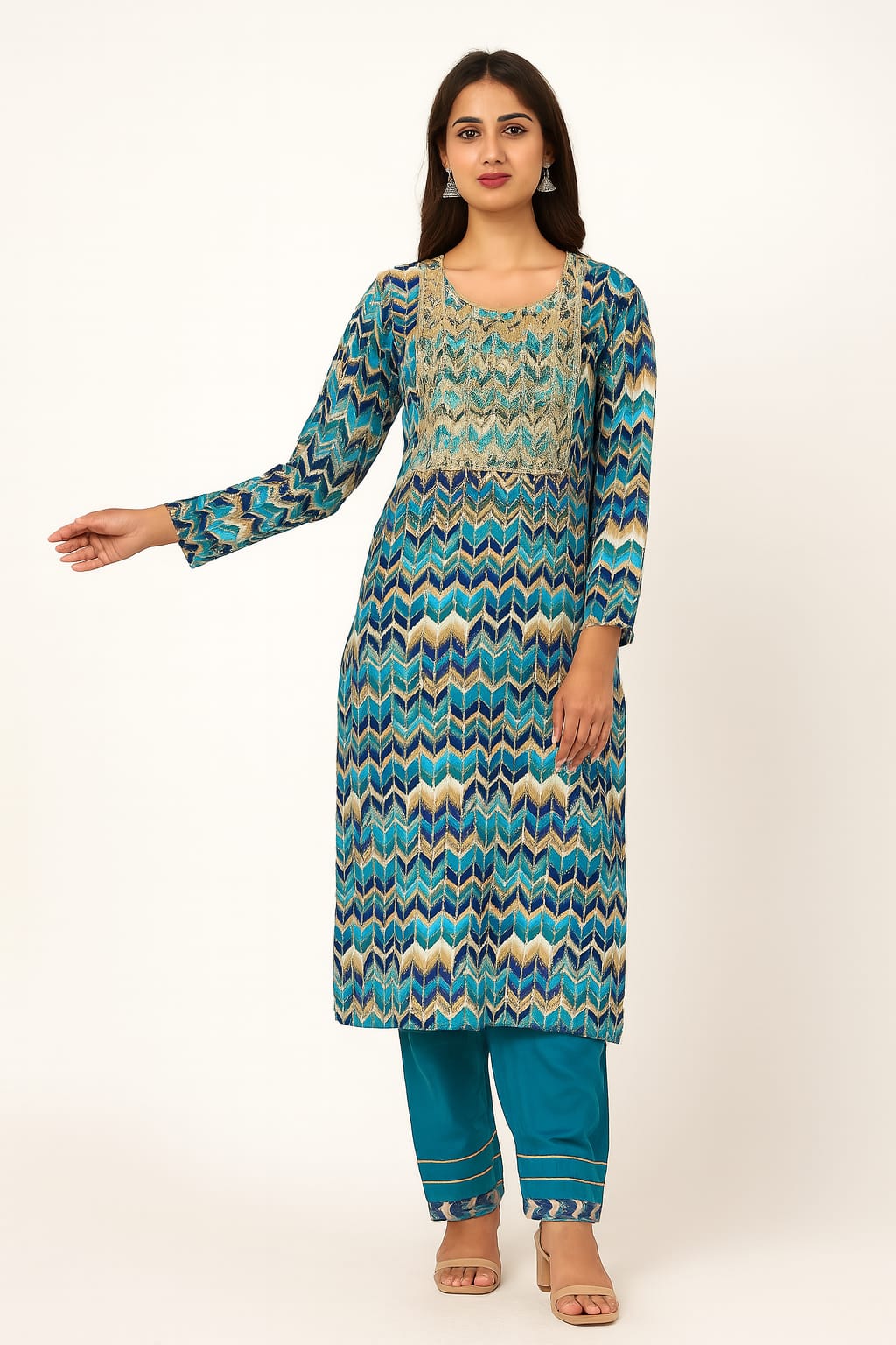 This isn’t just a kurta set. It’s a walking, twirling, compliments-collecting vibe. With zesty zig-zags, luxe embroidery, and colors brighter than your last situationship—this one’s made to slay brunch, poojas, and “beta bas ek rishta dekh lo” moments.