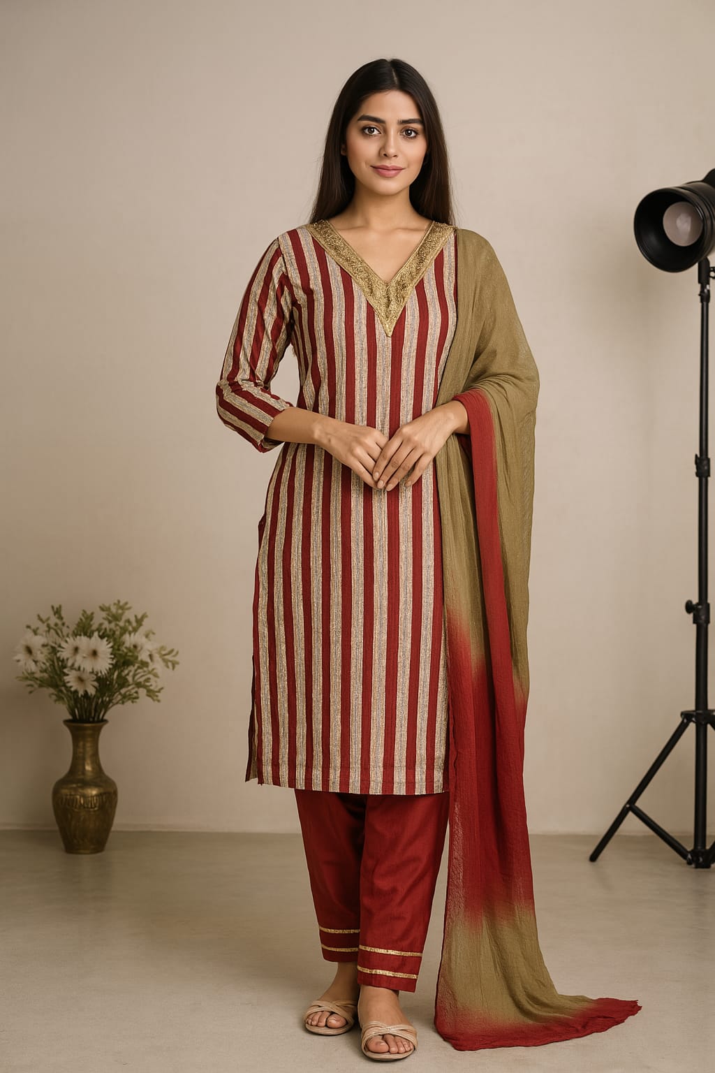 Red stripes wali suit set kiya order—bahut hi festive vibes deta hai ✨