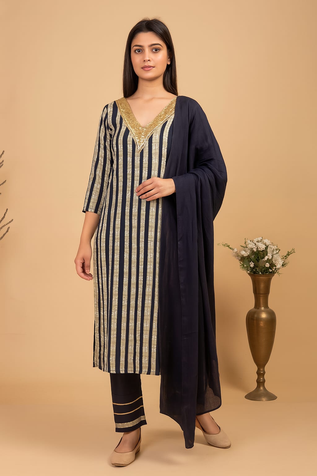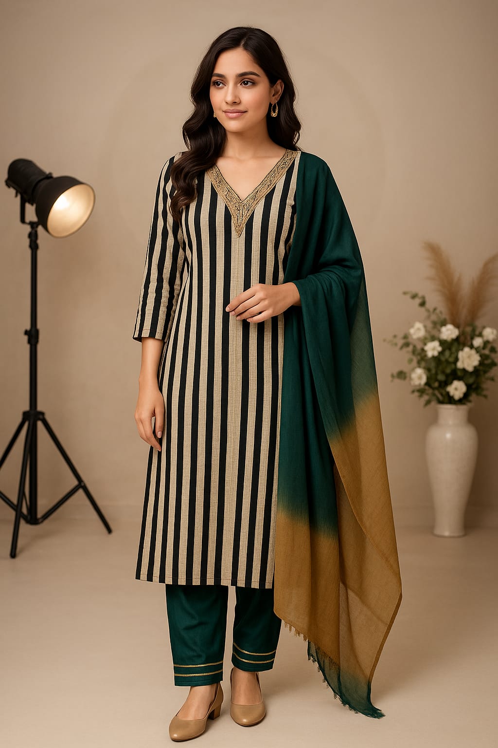 Step into a kurta set that’s as straight-up premium as your selfie angles and as classy as your “no-reply” texts. Whether you pick navy, wine, or forest green—this 3-piece stunner (kurta + pant + dupatta) is made for women who walk like the ramp is just another hallway.