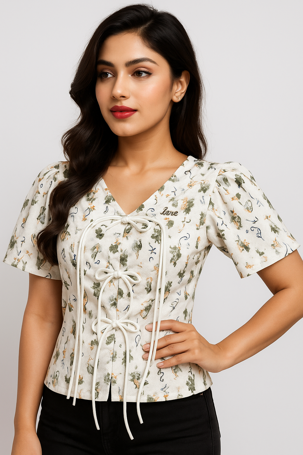 The puff sleeves and front tie-up detail are so chic. Fabric is also very comfortable.
