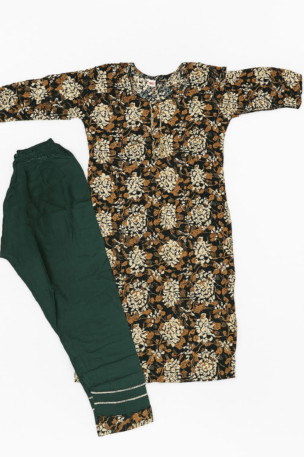 Dive into drama with this rich floral-printed kurti paired with deep green pants that hug you like your mom after you finally came home on time. The black base is as mysterious as your browser history, and those golden blooms? Let’s just say, they do all the talking when you walk in.